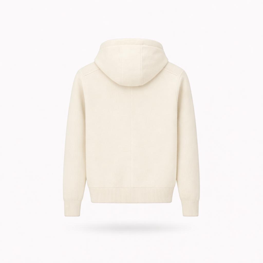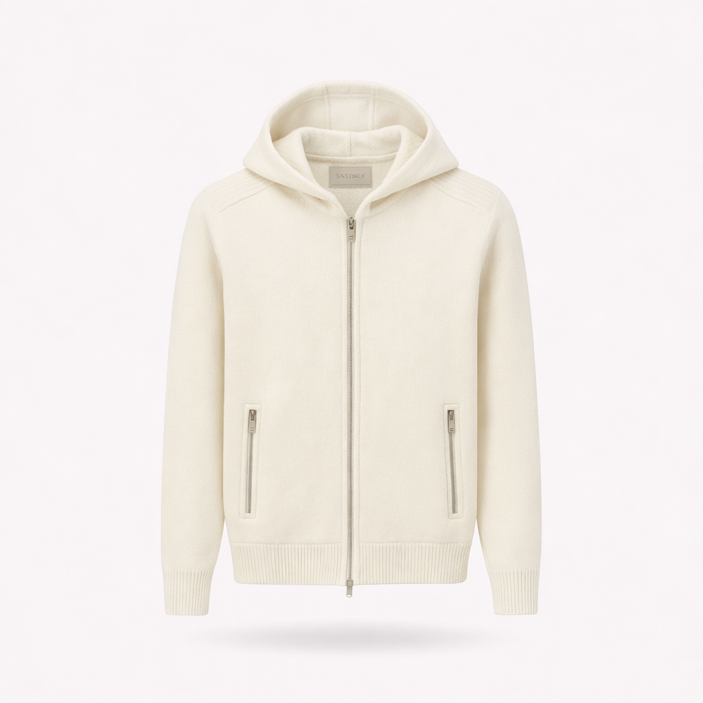 Clean knit cardigan with a full zip front and soft hood. Crafted from a smooth, medium-weight knit that provides comfortable warmth for cooler days while remaining light and breathable for spring. Finished in an elegant off-white tone with a timeless, refined silhouette.