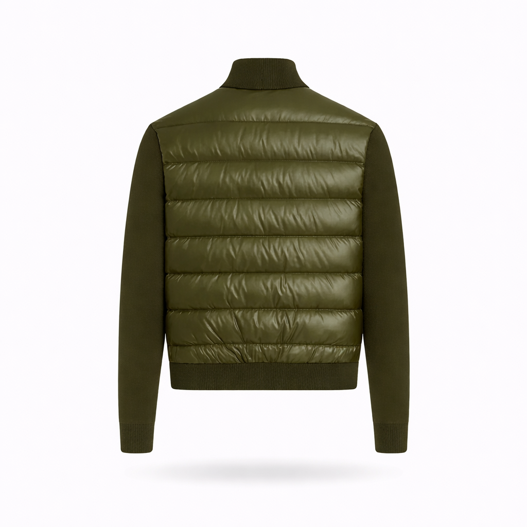 Refined knit cardigan with a lightly padded front and high collar. Crafted from a warm, structured knit blend that provides insulation for colder days while remaining comfortable for transitional seasons. Finished in a deep olive tone with a clean, tailored silhouette.