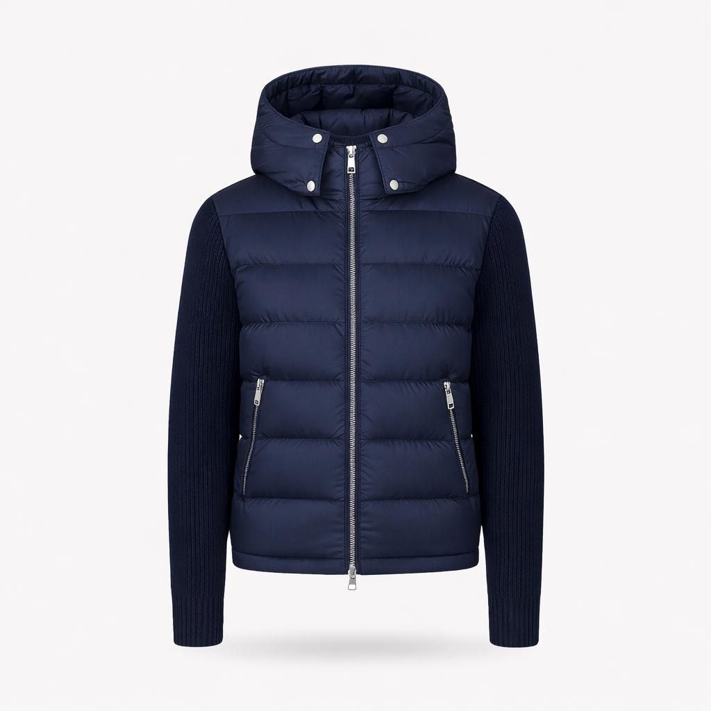 Refined knit cardigan with a quilted padded front and hood. Made from a premium knit blend that provides warmth in colder conditions while remaining breathable for spring and autumn. Finished in a deep navy tone with a clean, structured silhouette for a timeless old-money look