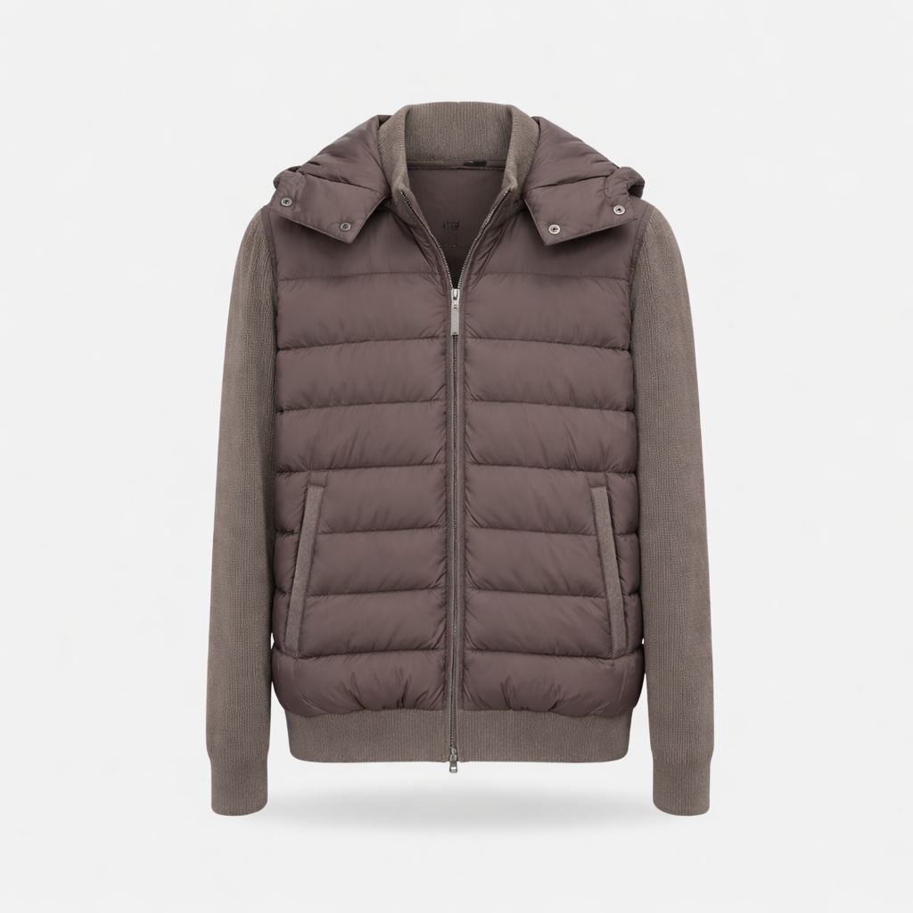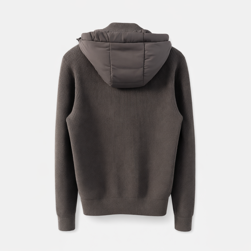 Elegant knit cardigan with a softly padded front and hood. Crafted from a warm knit blend that offers insulation for winter while staying comfortable during milder spring days. Designed with a balanced weight and a clean, timeless silhouette suitable for refined everyday wear.