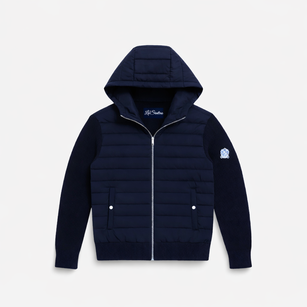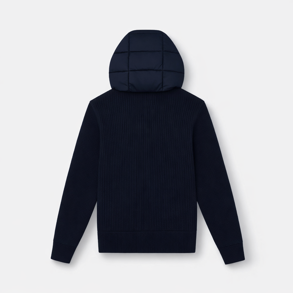 Premium knit cardigan with a quilted padded front and hood. Crafted from a soft knit blend that provides warmth during colder winter days while remaining breathable for spring wear. Designed for comfortable layering with a clean, refined silhouette
